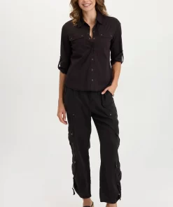 XCVI Women’s Shop Arvin Perforated Poplin + Jersey Tabbed 3/4-sleeve Snap-up Top | Black