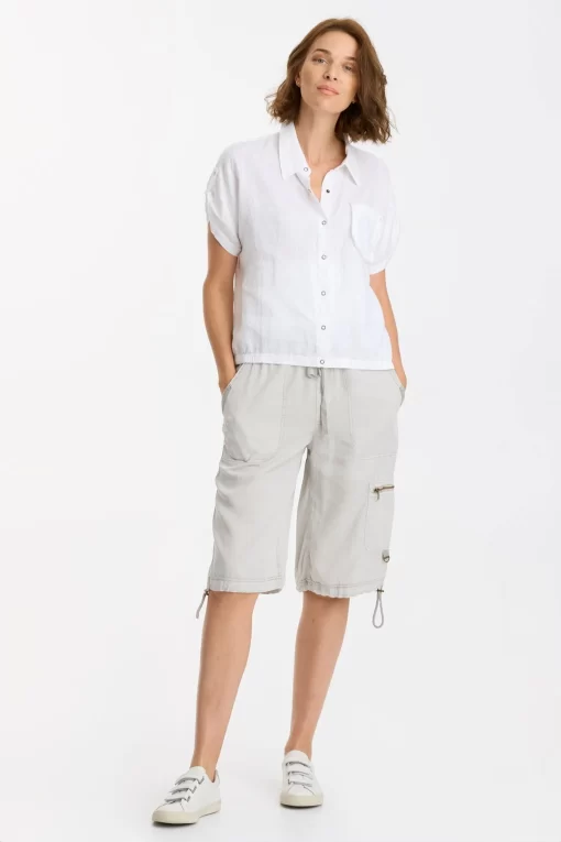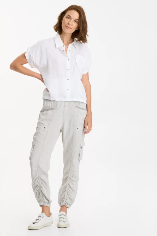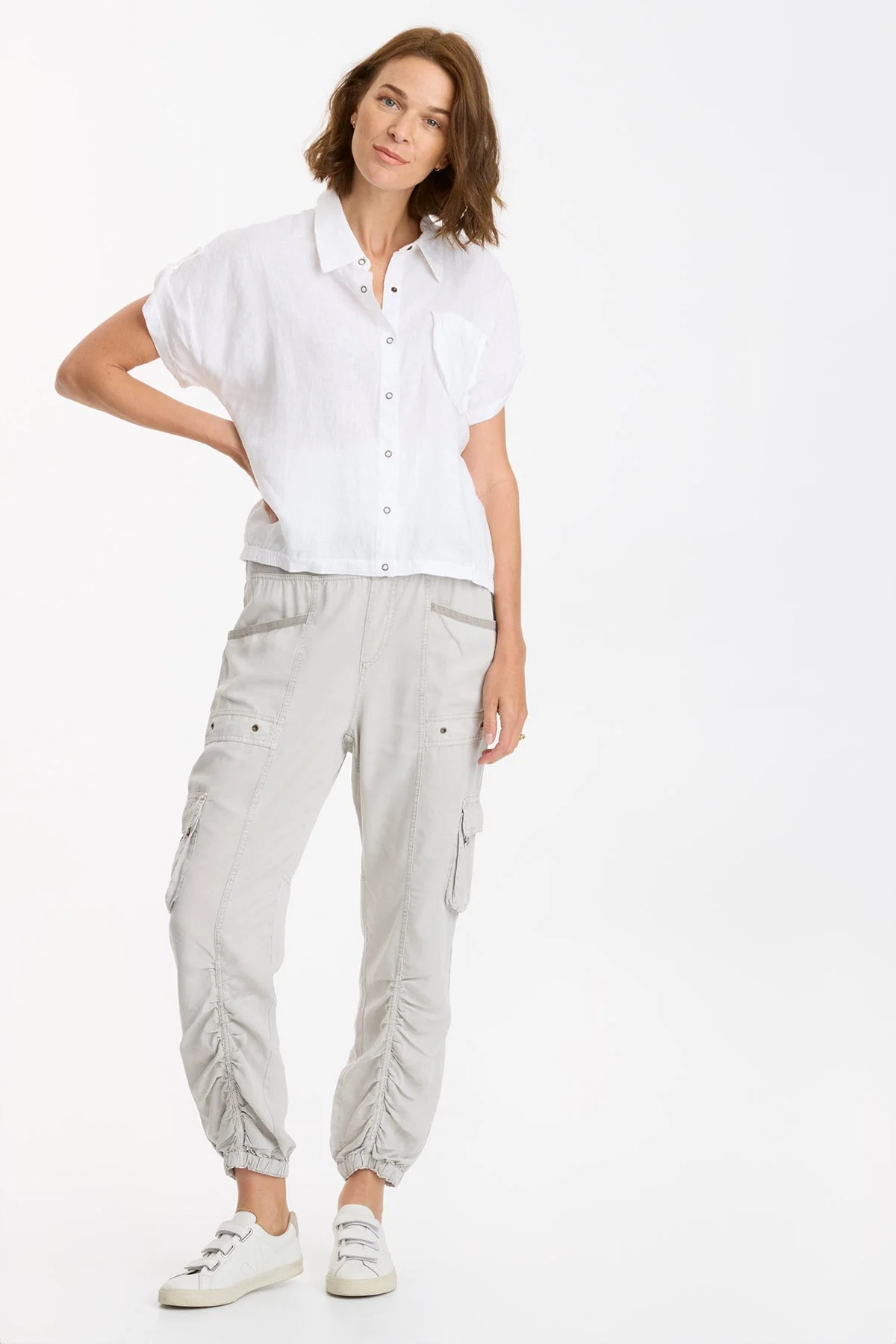 In light linen, Abner features a traditional collar, dolman sleeves, raw-edge patch pockets, a ruched hem with elastic sides, tabbed short sleeves, and contrasting back side panels in slub jersey.