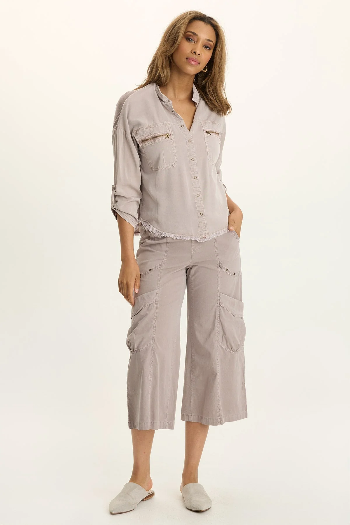 A re-boot back to our roots, this guacho style crop comes complete with Antique Brass hardware, fun exaggerated pockets and a pull-on waist.