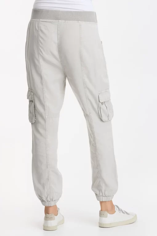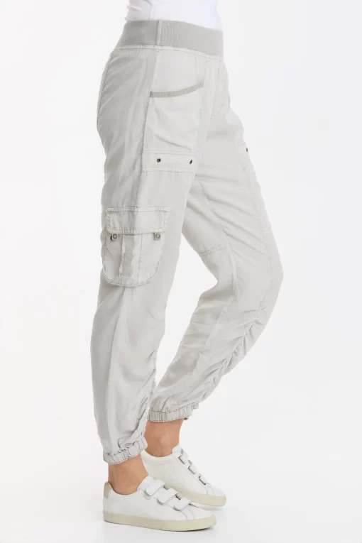 Flattering seaming and ruching at the front leg brings plenty of curve-conforming detail to this soft twill, banded leg pant. A contrast rib pull-on elastic waistband and cargo pockets with twill tape and antique brass hardware details finish off this style.
