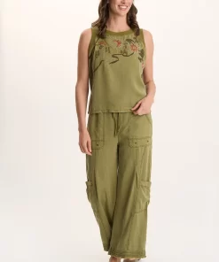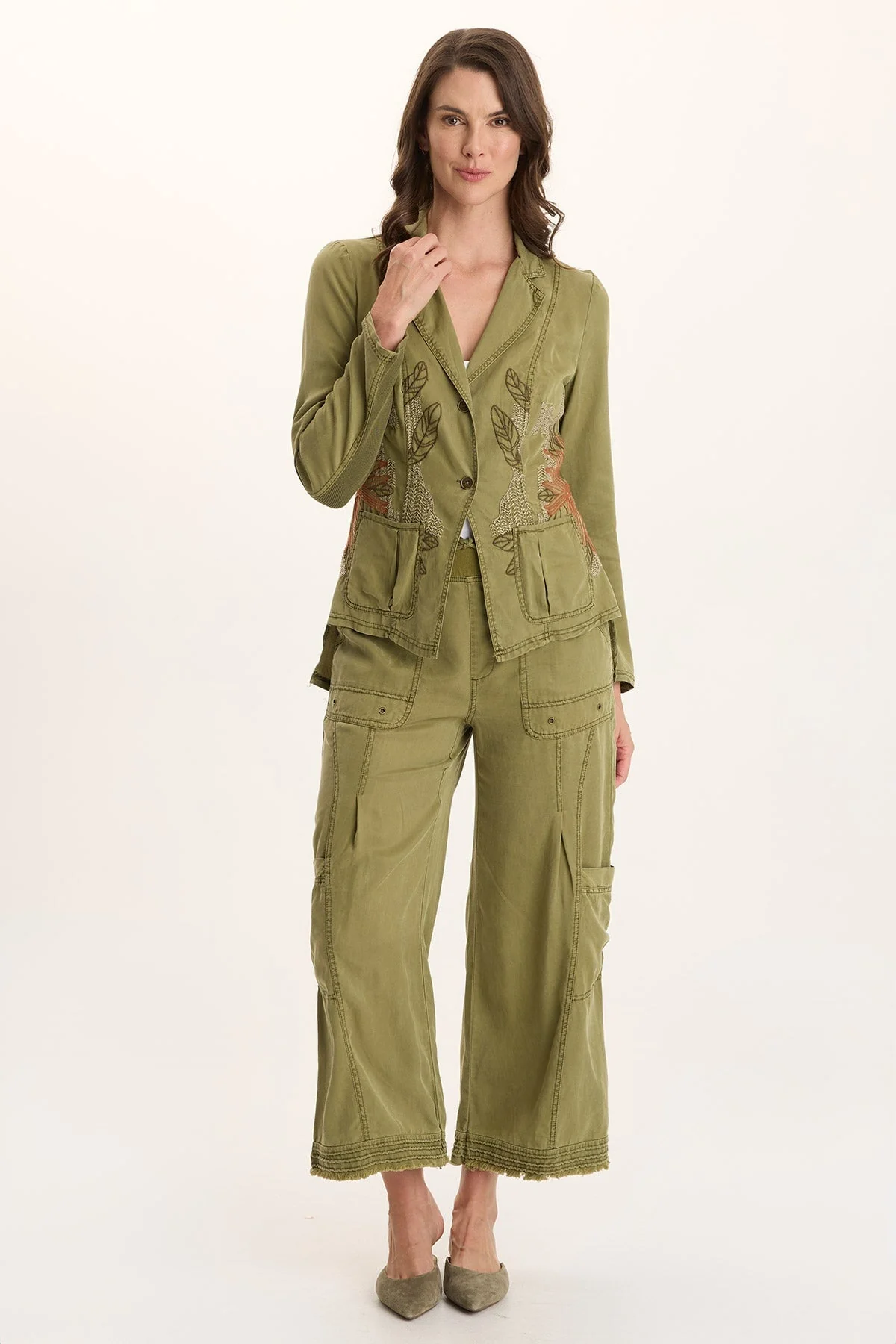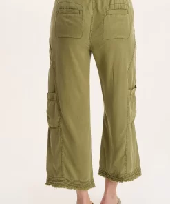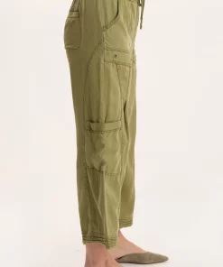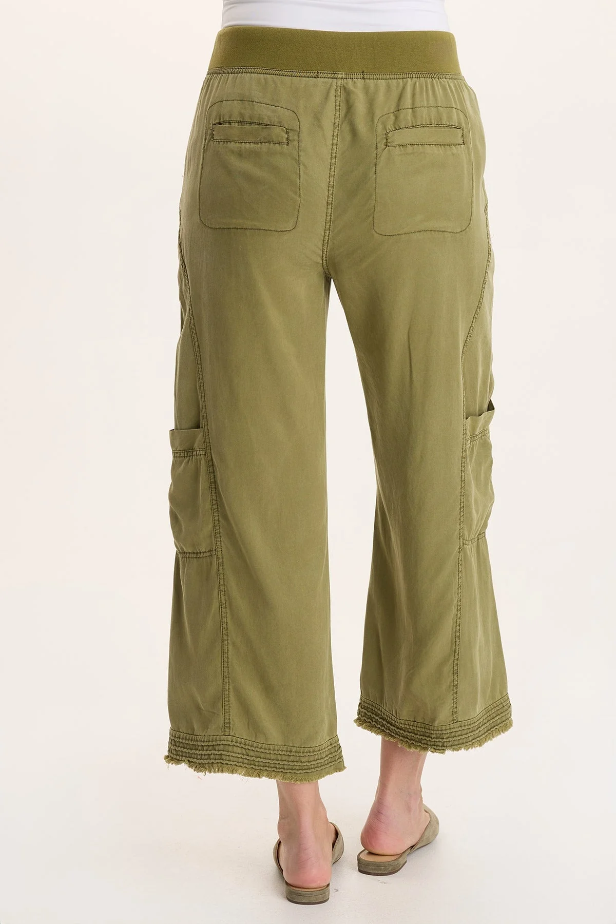 A stretchy, thick knit drawstring waistband ensures extra comfort on this wide-leg Soft Twill cargo style. Plentiful pocket, an added central pleat at the leg for added soft volume, and raw-edge hem round out the utility-inspired style.