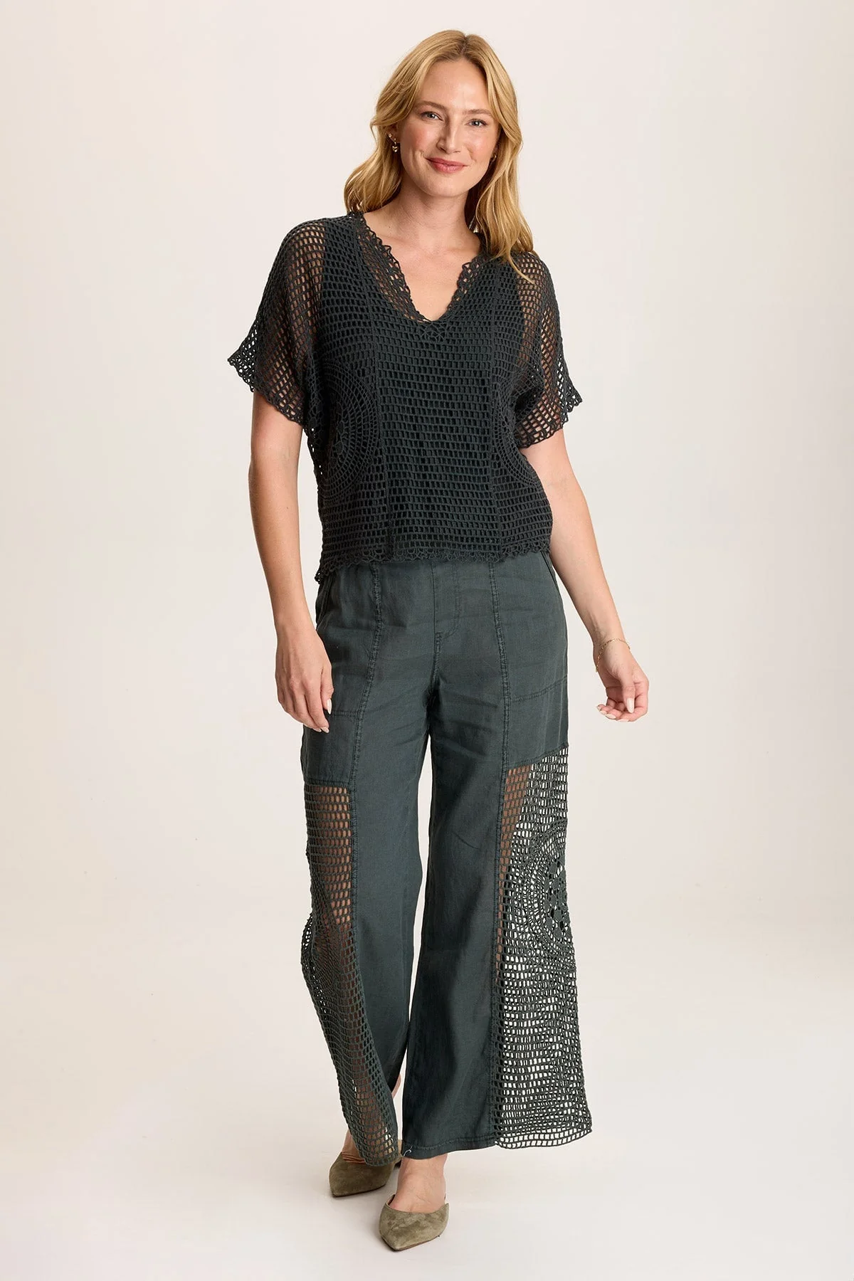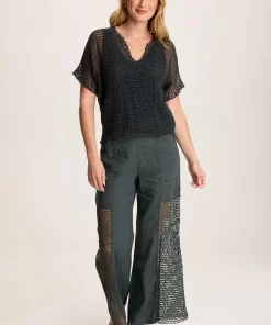 A circular crochet design adorns the side seams of this mesh crochet top. Centre Top has an attached jersey lining and a decorated v-neck.