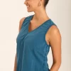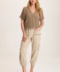 A circular crochet design adorns the side seams of this mesh crochet top. Centre Top has an attached jersey lining and a decorated v-neck.