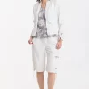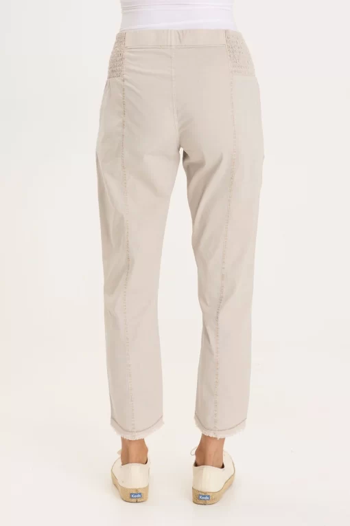 An ankle length slim fit pant with a pull on waist that features shirred panels, two inseam pockets, two patch zippered pockets, and a raw edge rounded hem.