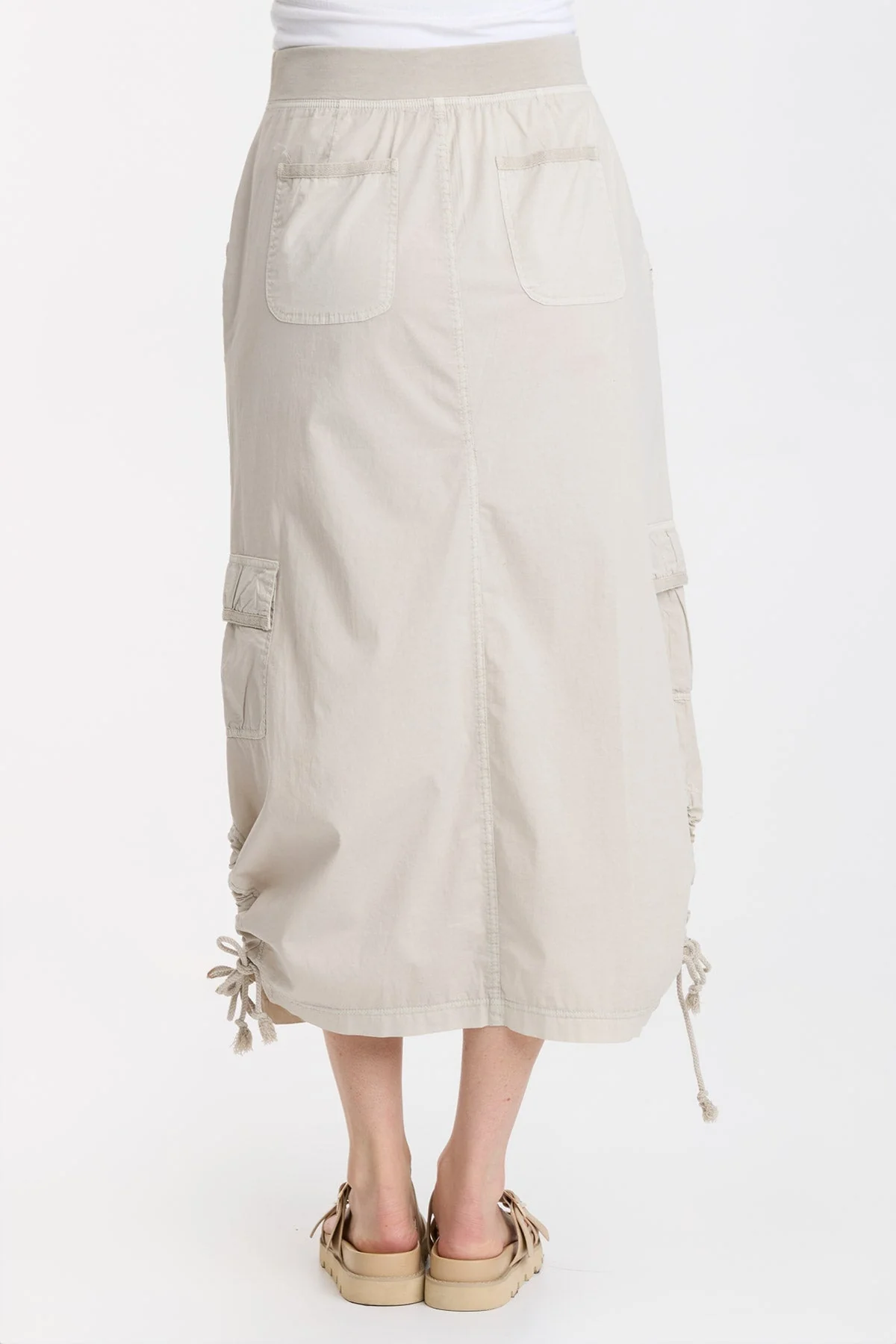 Cinchable cords adorn high sides on this maxi skirt with antique brass hardware stoppers. A pull-on elastic jersey waistband, twill tape ruched flap cargo pockets, and bell pull zippers adorn Armel for MAXI impact.