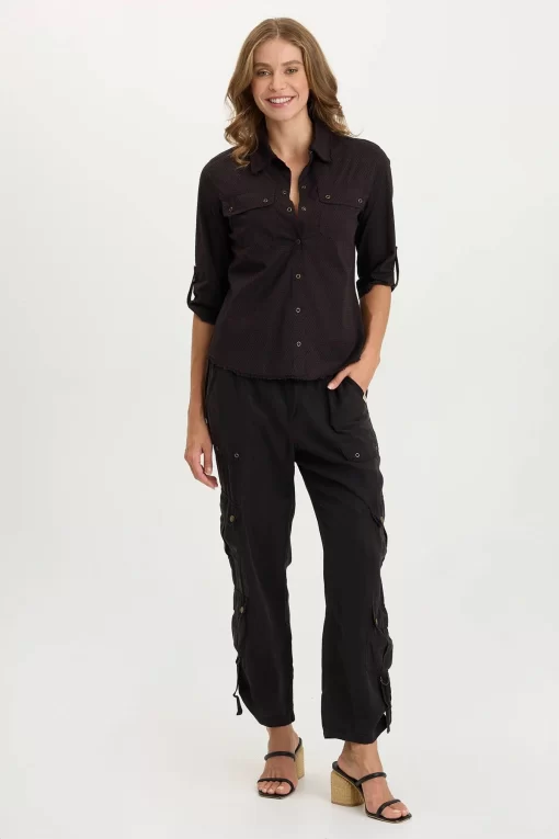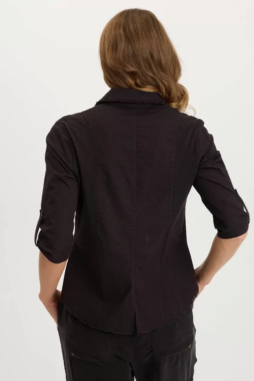 Arvin Snap-Up features a slew of cool things! With two flapped and snapped breast pockets, an open back seam, tabbed 3/4 sleeves, a contrasting slub jersey inserts all around a perforated poplin base.