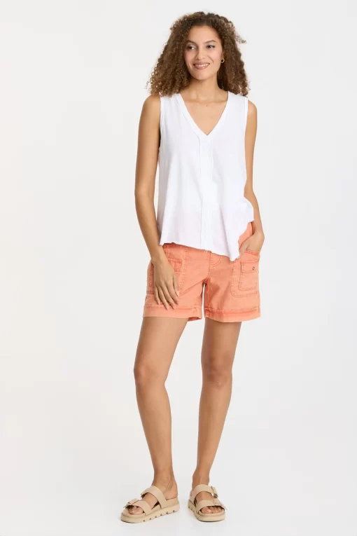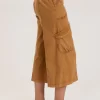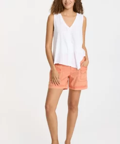 Brass ring snaps are featured on two mini cargo pockets and side seam tabs. With a high waist cut and an elastic waistband, this classic cotton linen short is a must for your seasonal update!