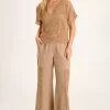Brass ring snaps are featured on two mini cargo pockets and side seam tabs. With a high waist cut and an elastic waistband, this classic cotton linen short is a must for your seasonal update!