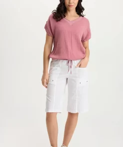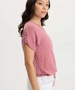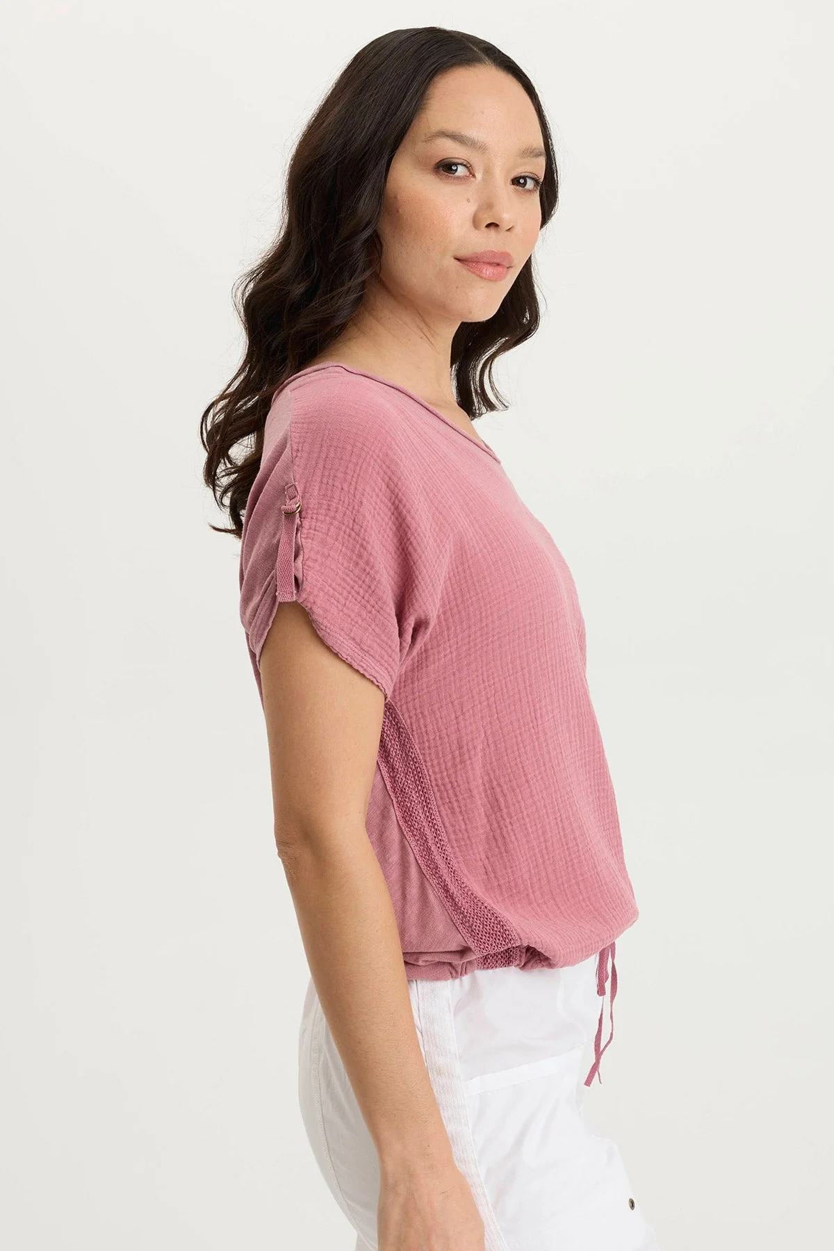 In a traditional XCVI silhouette, Bower V-Neck Tee has tabbed short sleeves, mesh trim inserts, a cinchable bubble hem and a contrasting slub jersey back panel.