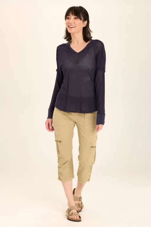 An exaggerated V-neck teams up with a drop shoulder look in our latest sweatshirt-like pullover. An airy mesh and rib details make Bullock oh-so-comfy and classy!