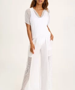 A circular crochet design adorns the side seams of this mesh crochet top. Centre Top has an attached jersey lining and a decorated v-neck.