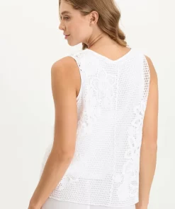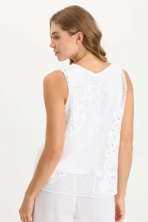 Lined mesh and floral crochet tank with a v-neckline and an a-line silhouette.