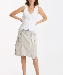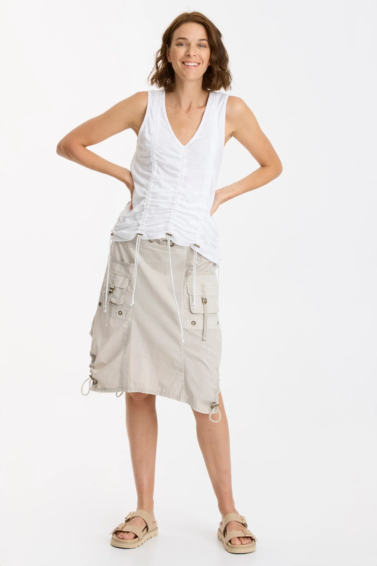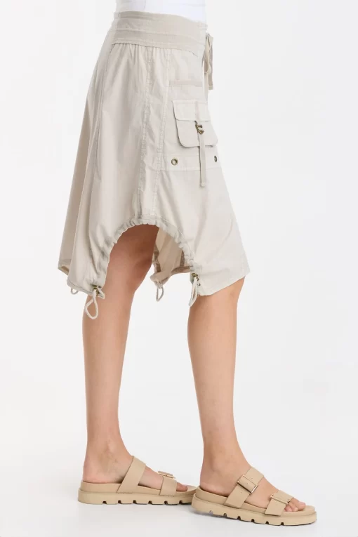 A cinchable chorded high side mini with antique brass stoppers, a raw-edge contrast ribbed waistband, mini cargo pockets with buckles and tabs, and antique brass hardware eyelet details.