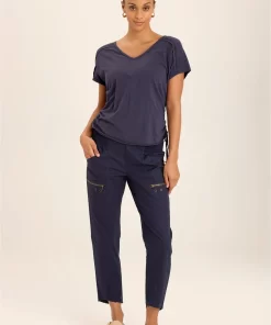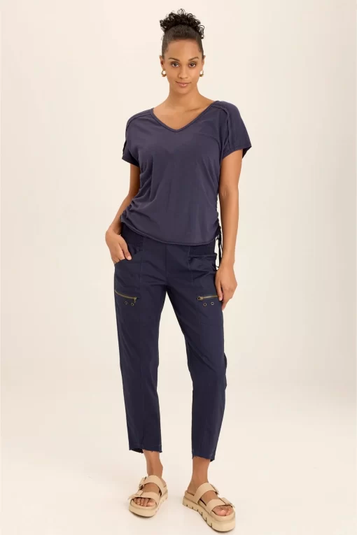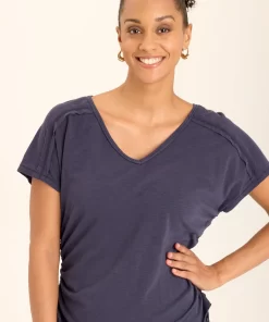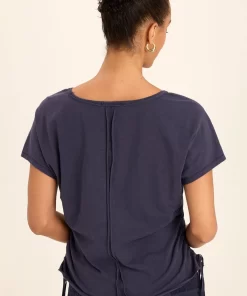 Cinchable side cords grace this v-neck slub jersey top; also featuring a front yoke, dolman sleeves, and raw-edge details throughout.