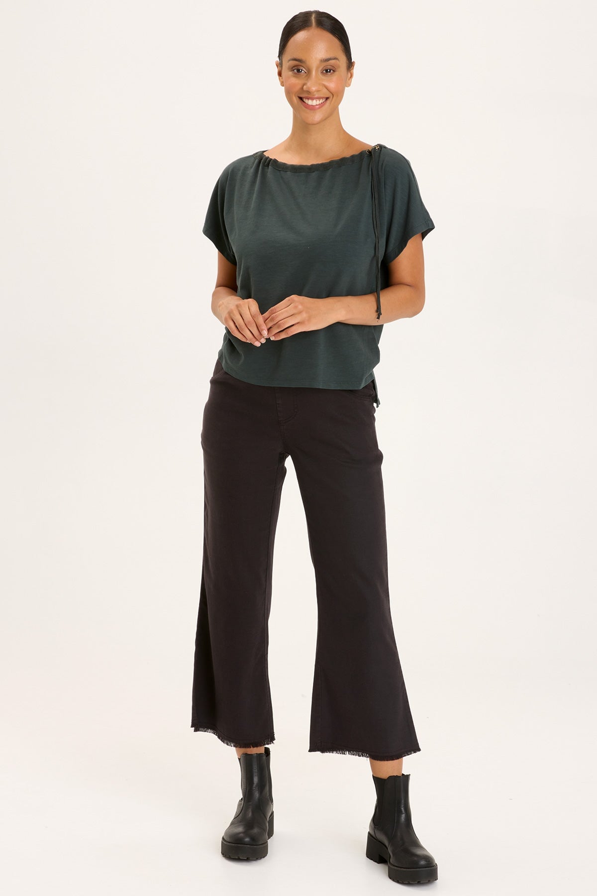 A cinchable, adjustable drawstring neckline offers the unique opportunity to wear Exelda off the shoulder or on. A slightly boxy fit keeps things casual and cute, while stretch jersey ensures ultimate comfort.
