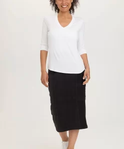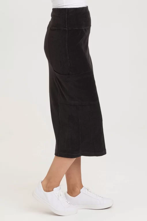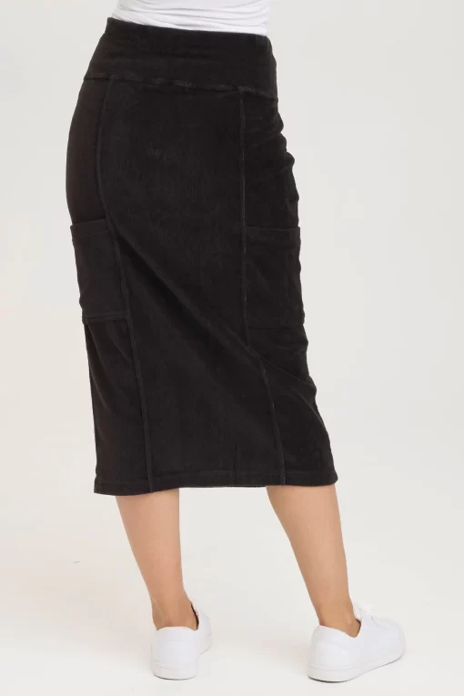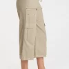 A fitted but functional flared leg opening skirt with cargo patch pockets and a pull-on waist.