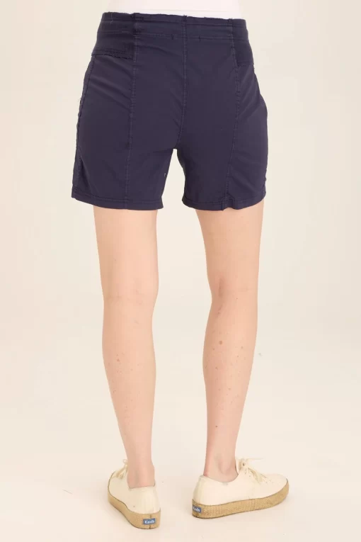 This classic poplin drawstring-waist short features a raw-edge contrast ribbed waistband, twill tape details, and cargo pockets with flat snaps.