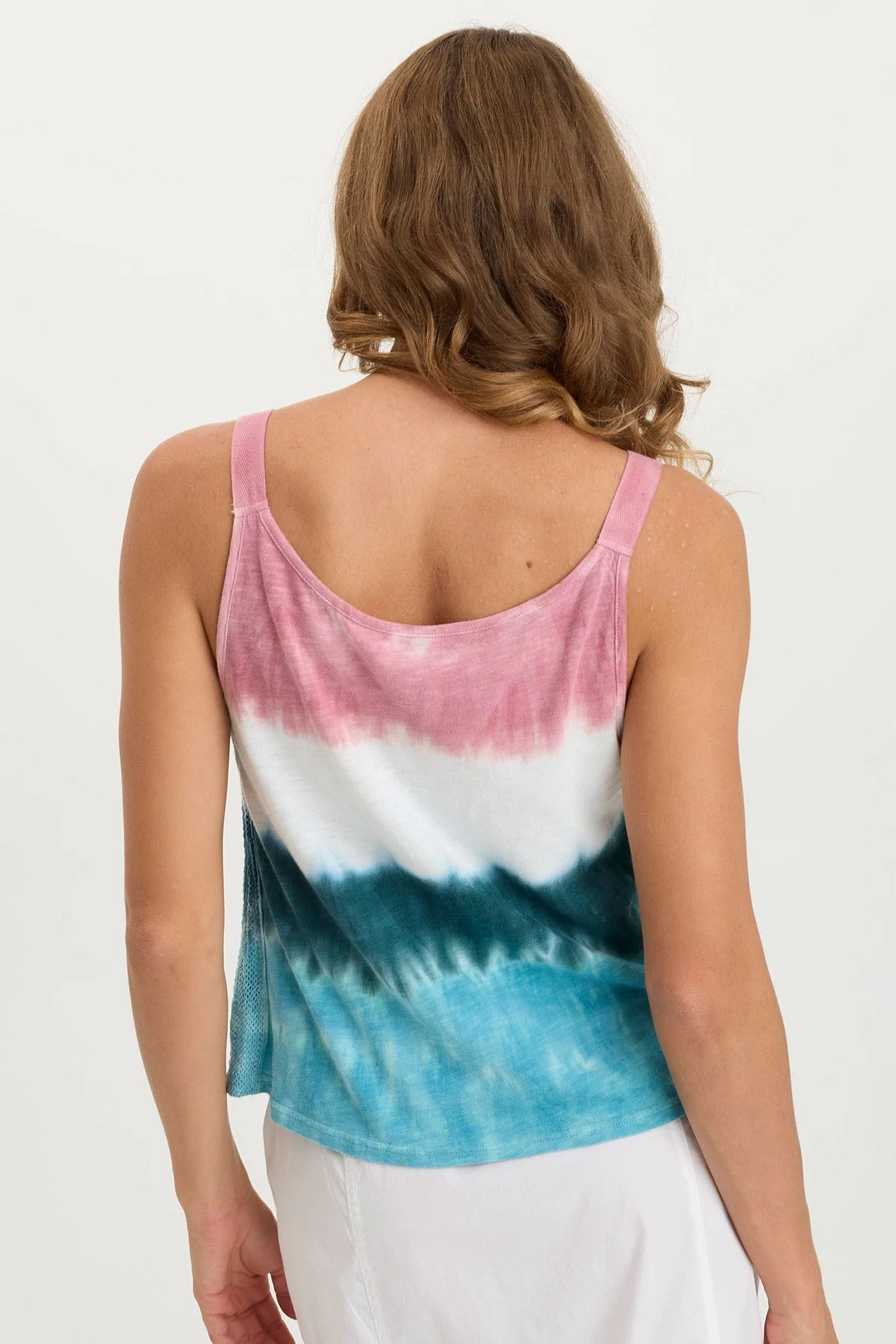 - Color Description: Pink, Deep Teal, Aqua and White Horizontal Sectional Tie-Dye