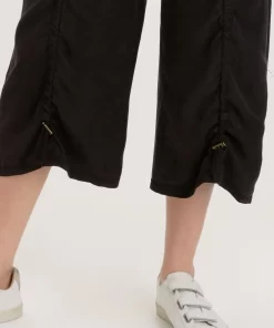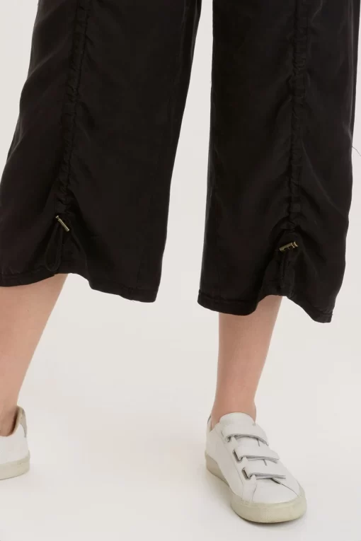 Ruched front leg, double pockets, front zip hooded crop jumpsuit.