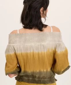 Billowing three-quarter sleeves with elastic bands pair up with layered elastic shirring at the neck so Jolia can be worn on or off the shoulder. A banded ruffle hem finishes this semi-cropped Cocoon Gauze style.