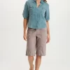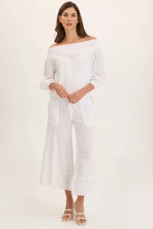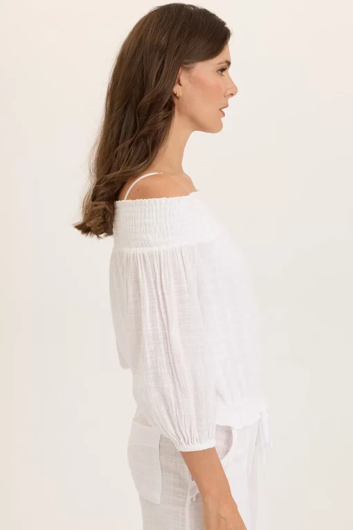 Billowing three-quarter sleeves with elastic bands pair up with layered elastic shirring at the neck so Jolia can be worn on or off the shoulder. A banded ruffle hem finishes this semi-cropped Cocoon Gauze style.