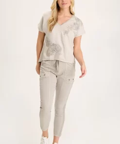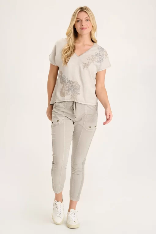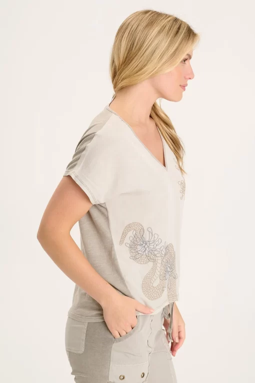 Another guest designer artwork piece, this v-neck tee has hand drawn embroidery and a back contrasting panel.