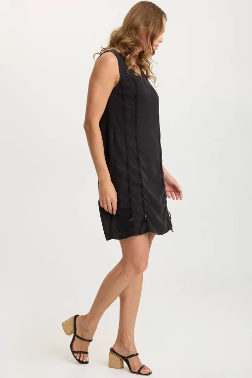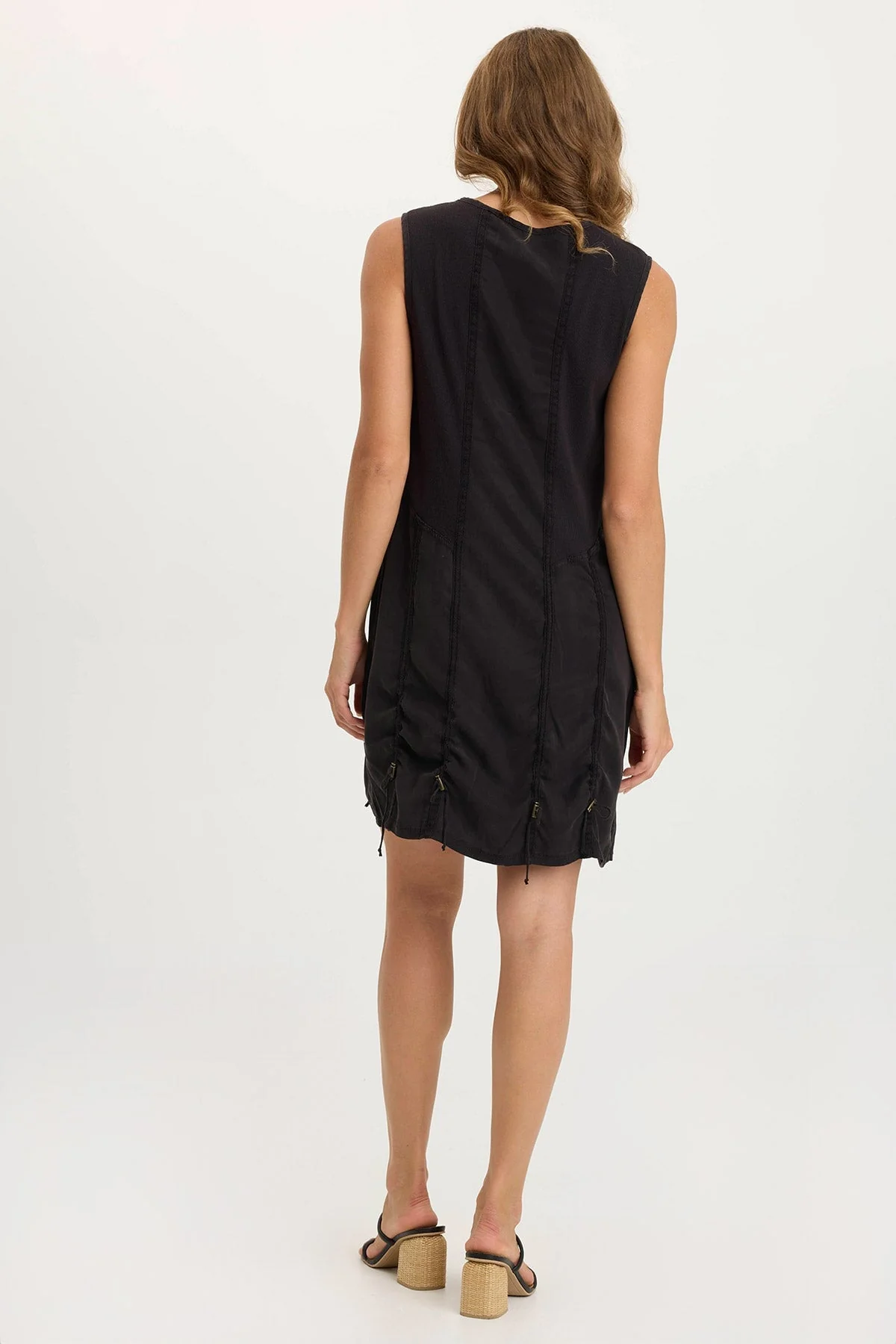 Corded drawstring cinches all around this tank dress. Karima has rib inserts and brass stoppers to help retain your customized cinching in this mini.