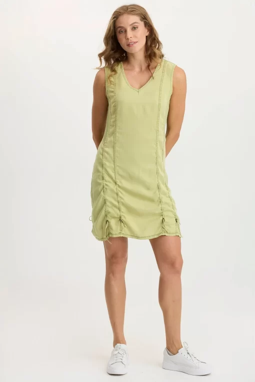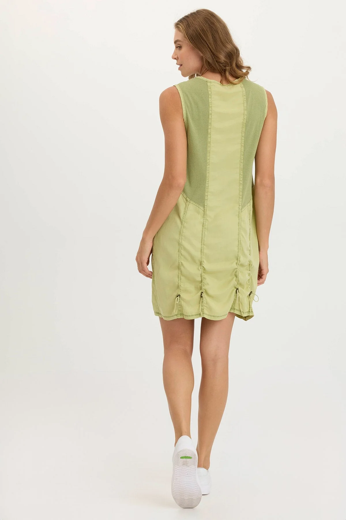 Corded drawstring cinches all around this tank dress. Karima has rib inserts and brass stoppers to help retain your customized cinching in this mini.