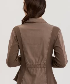 Sporty meets business in this zip front blazer. With rib contrast throughout and an elastic cinched waist, Keija brings fun pockets and striped cuffs new life.