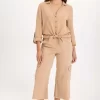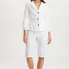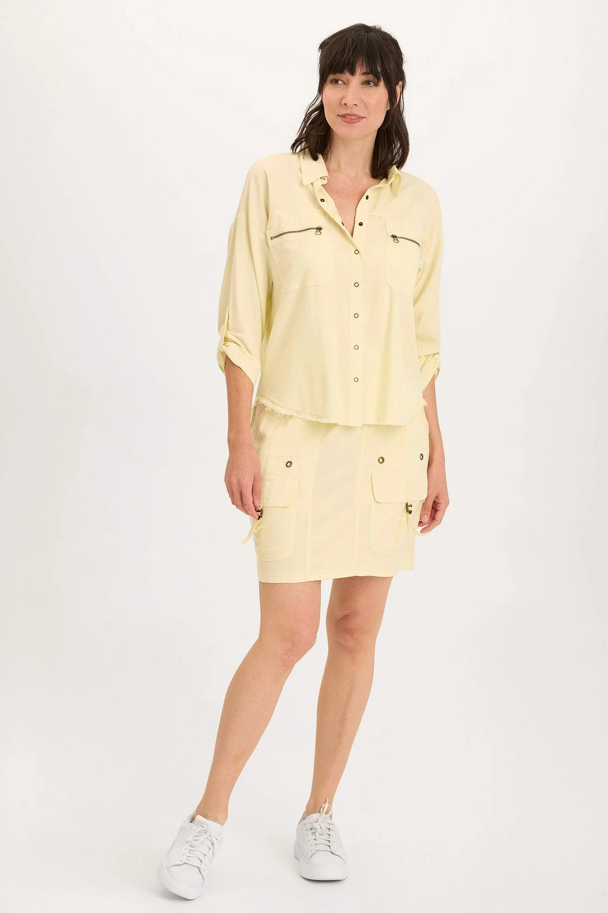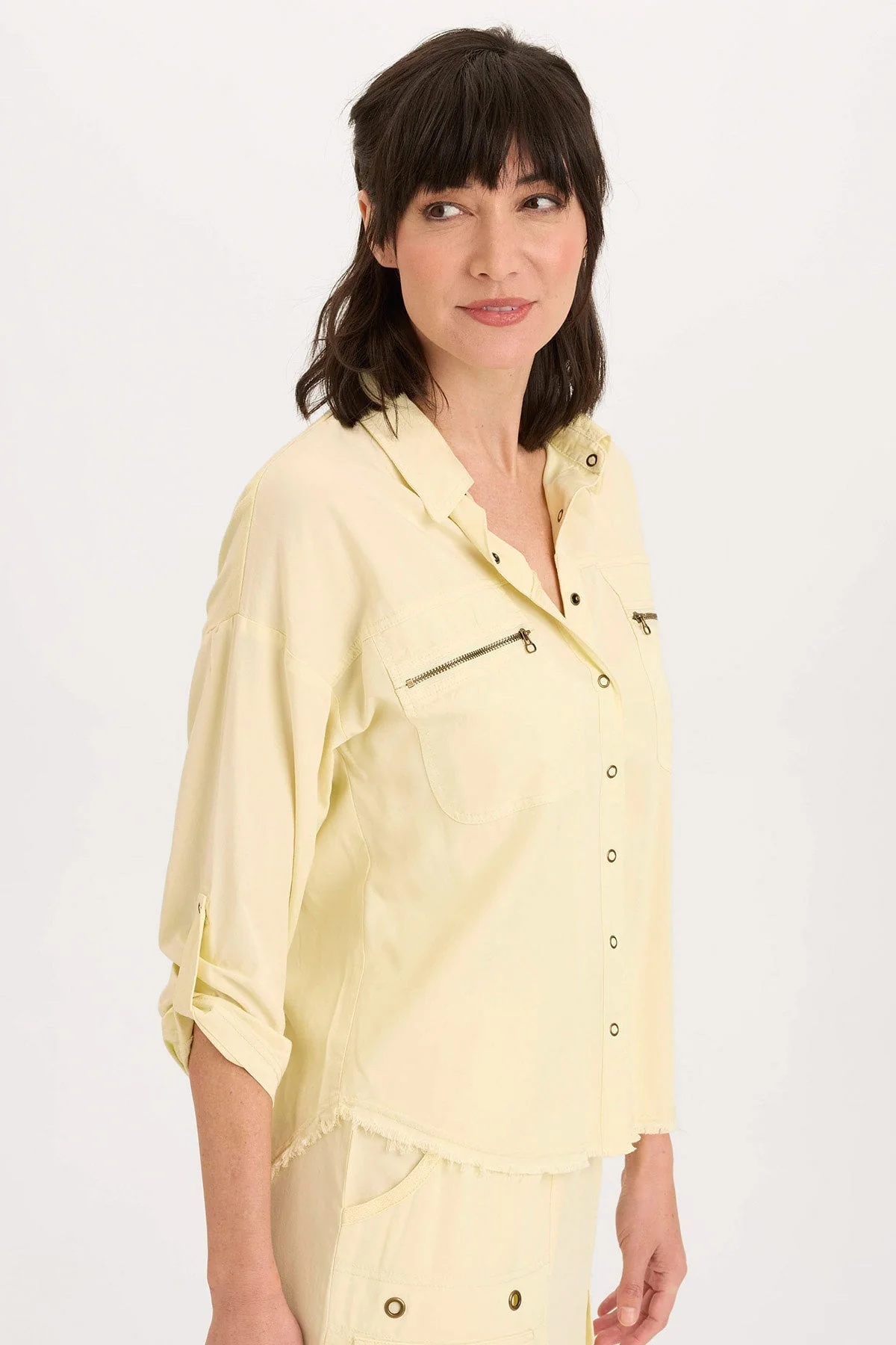 Tabbed three-quarter sleeves, zippered breast pockets, a classic collar, and a raw-edge hem round out this utility-inspired cargo shacket.