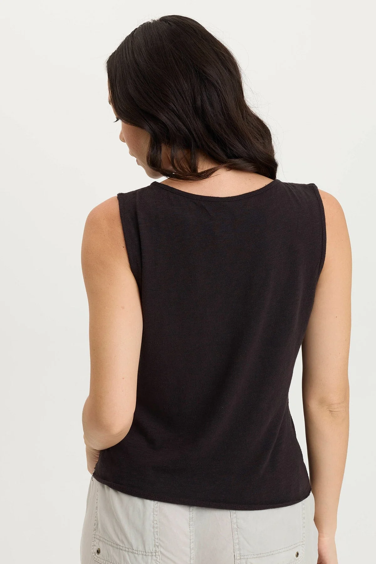 A novel idea, a perforated effect has been applied to our poplin to create the look of this simple tank. Landis has a contrasting slub jersey on the back and one lone breast pocket on a seamed front panel.