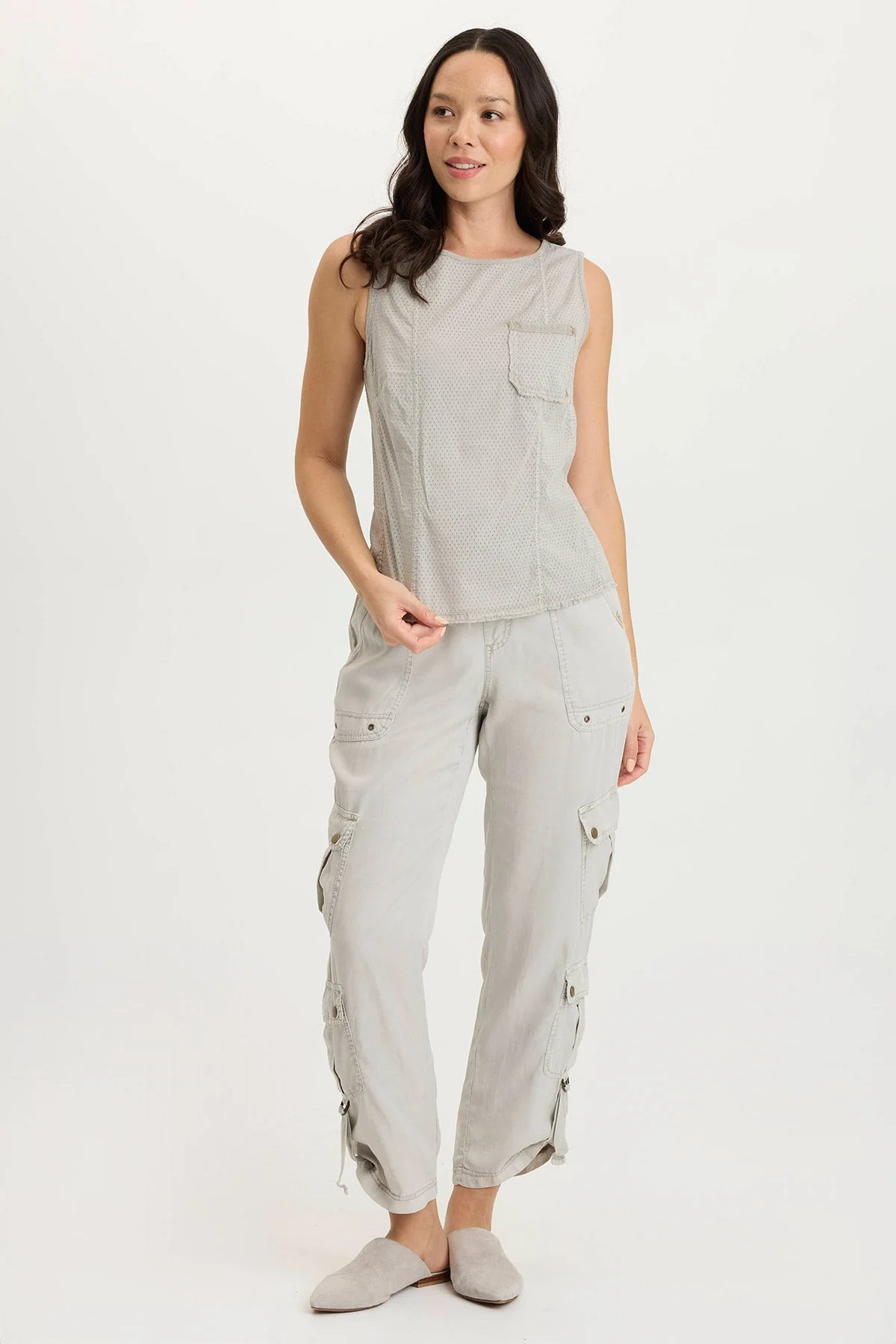 A novel idea, a perforated effect has been applied to our poplin to create the look of this simple tank. Landis has a contrasting slub jersey on the back and one lone breast pocket on a seamed front panel.