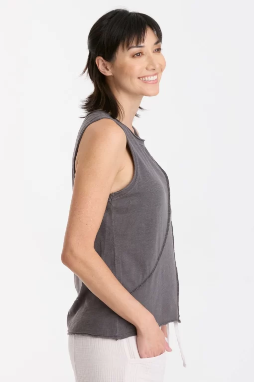 In soft stretchy jersey, Lave features reversed asymmetric seams, a crew neck, and raw edges throughout.