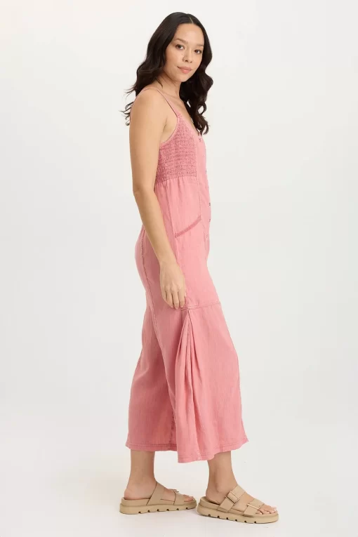 Simply the cutest and sleekest jumpsuit around! Leoda has ruching at the side bust, an elastic cinched back waist, snap up front closure, in-seam pockets and double box pleats dancing along the side seam of the leg.