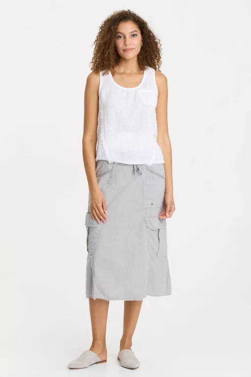 This time made in Cotton Linen, Bellamy brings the drama with exaggerated cargo pockets, adorned twill tape front pockets and antique brass eyelets. A rib-contrasted elastic drawstring waist compliments this slightly A-lined midi skirt.