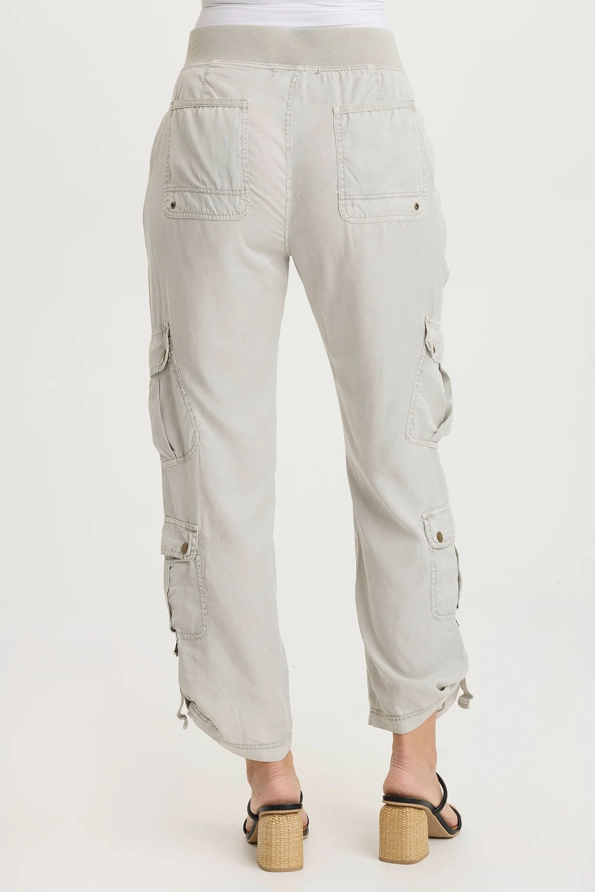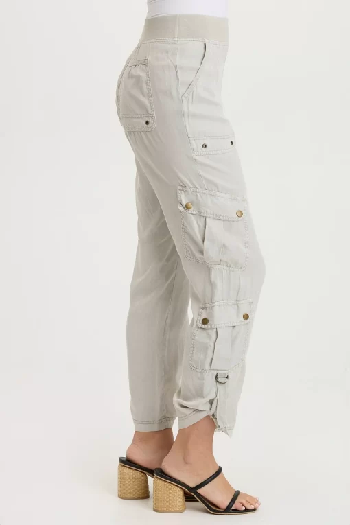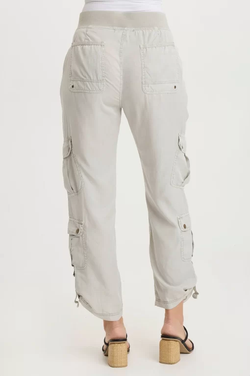 Lowe features a tabbed hem, multiple pleated cargo pockets, and traditional front and back pockets with an elastic pull-on waistband.