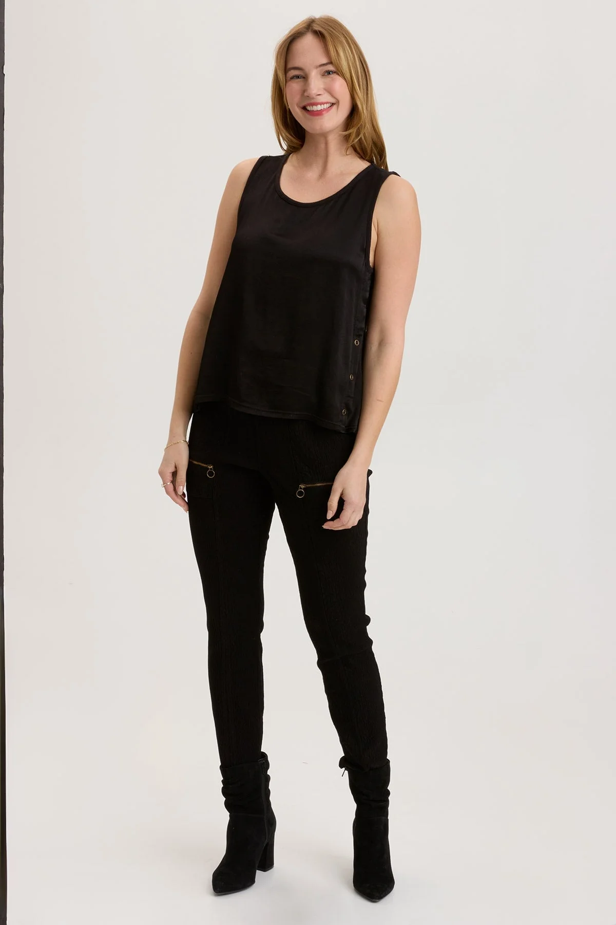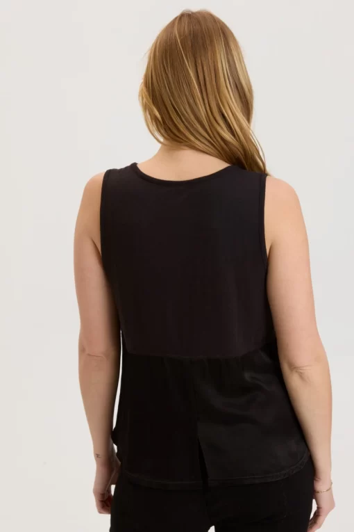 Welcome the Markos Tank with its functional side placket adorned with brass ring snaps, a split back lower panel and a bit of stretch across the back with contrast jersey.