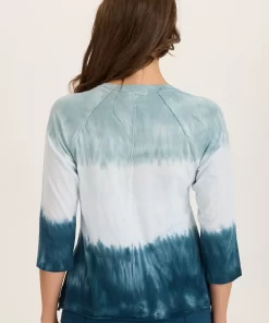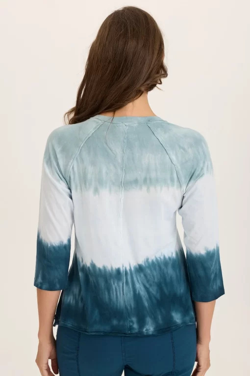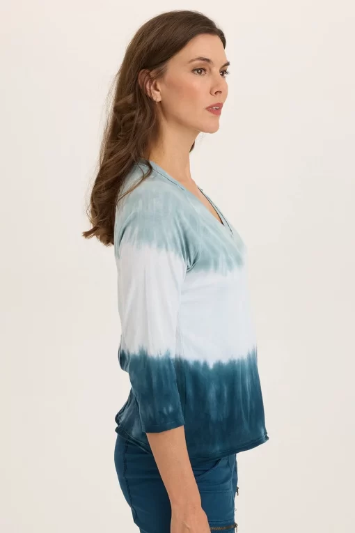Three-quarter sleeves and a v-neck grace this classic jersey tee.
