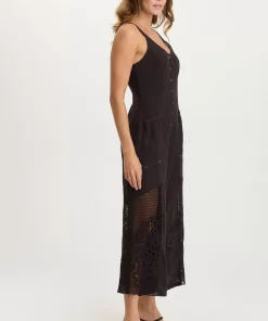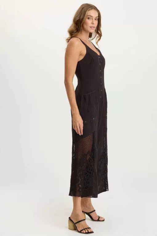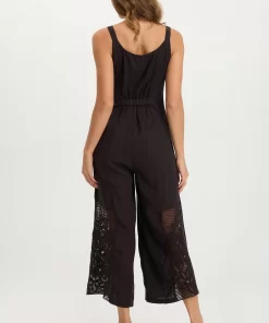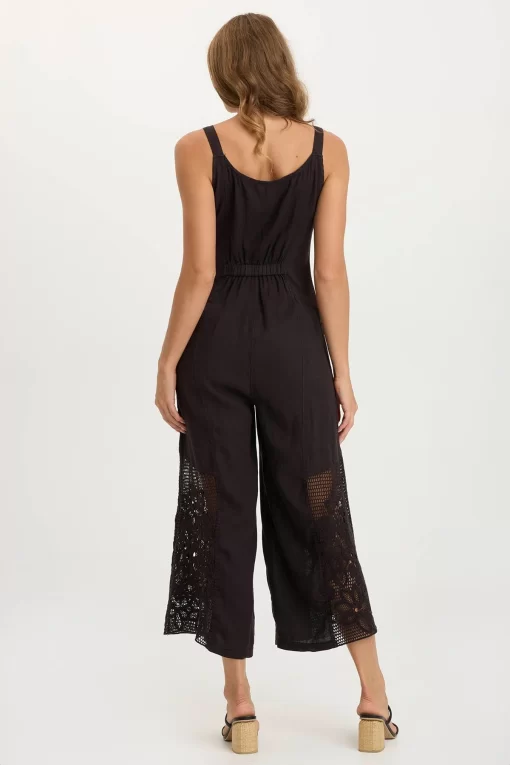 Crochet galore as Nairi Jumpsuit features mesh and floral crochet leg panels with rib insert contrast, twill tape straps, two front pockets and a snap-up front closure.
