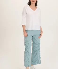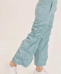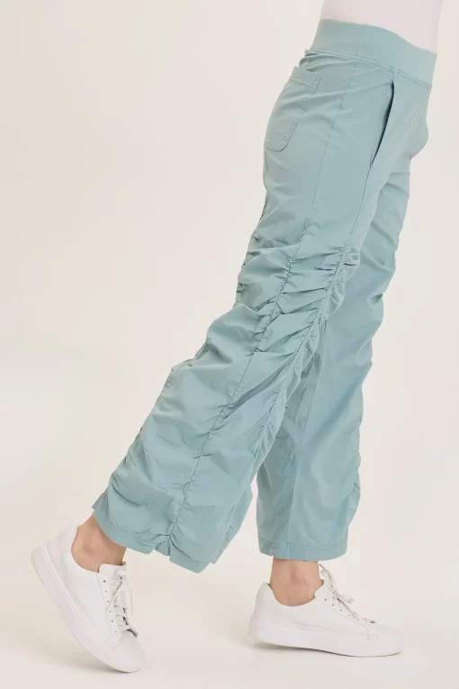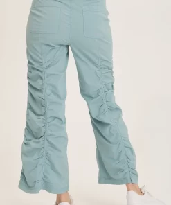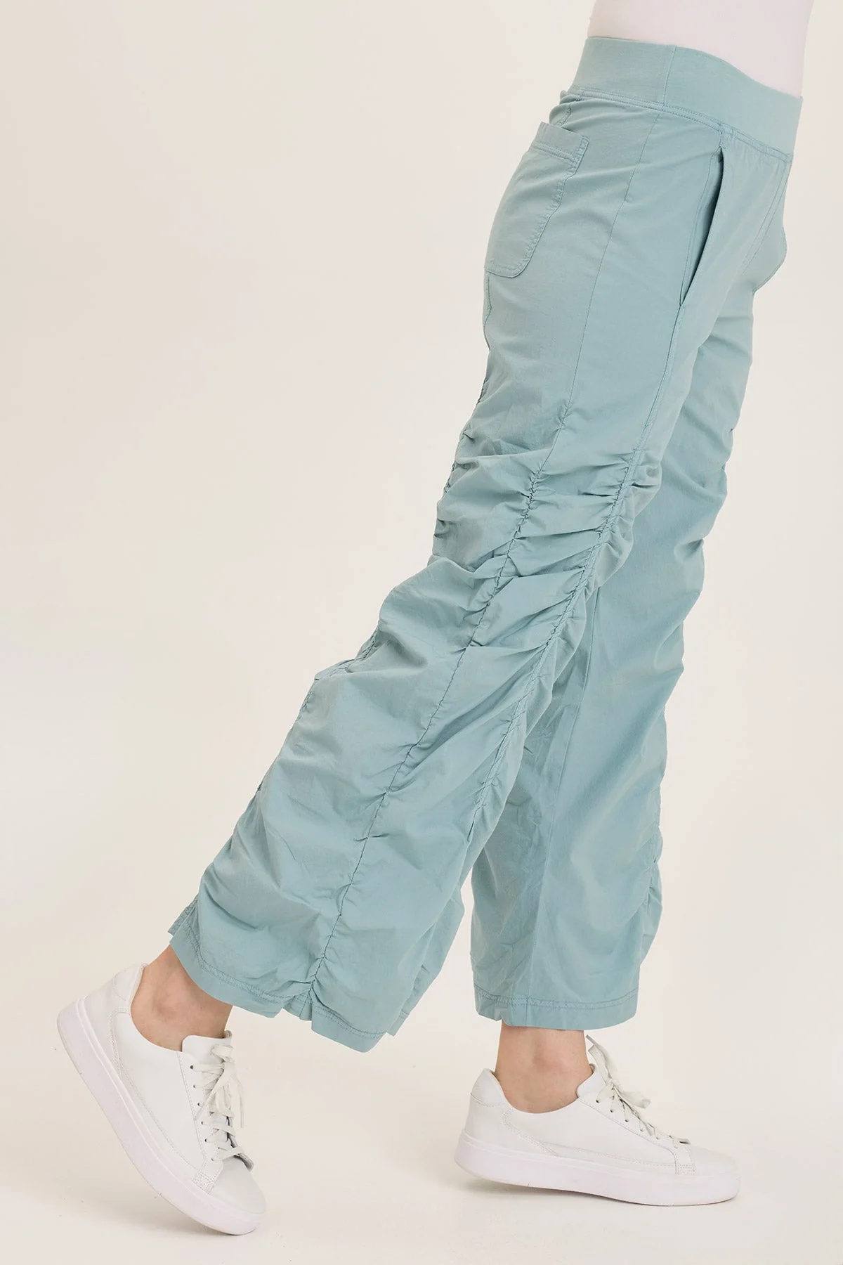 A pull-on stretch waistband and allover ruching adorn this flared split-hem gaucho style in lightweight Stretch Poplin.