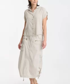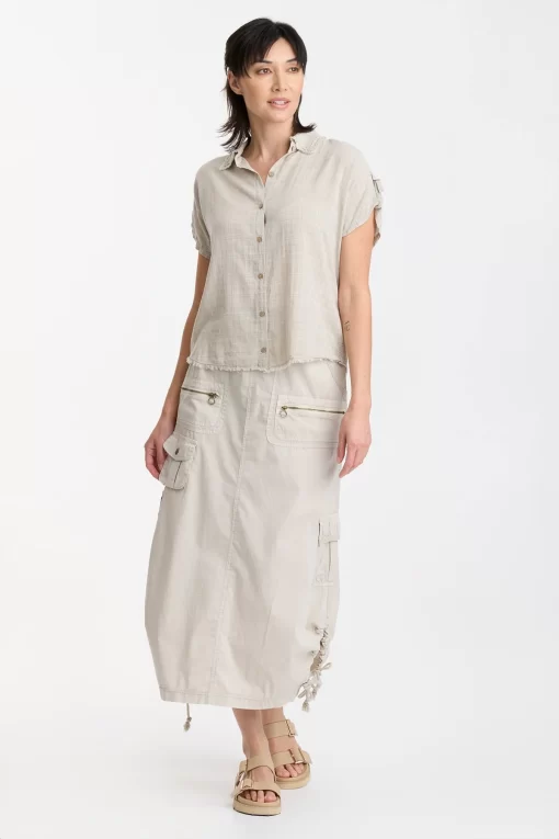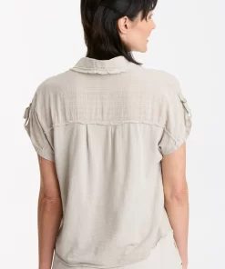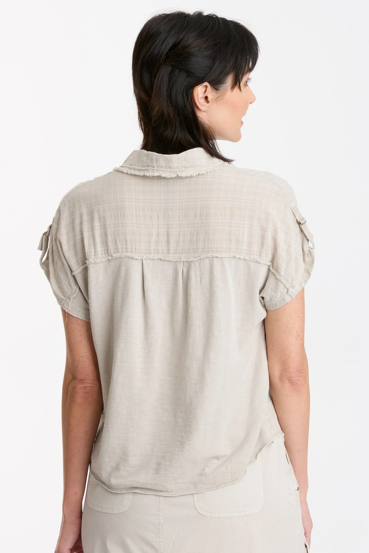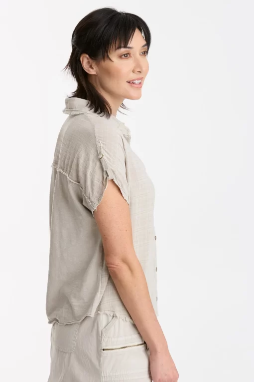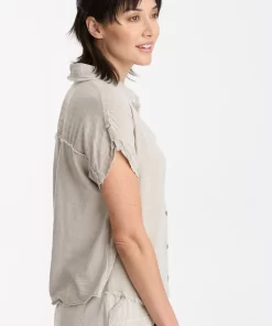 Coconut buttons along the center front, a raw-edge traditional collar, voluminous tabbed dolman sleeves, and a back yoke of contrasting slub jersey make up NinetteÕs classic-cool look.
