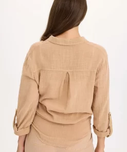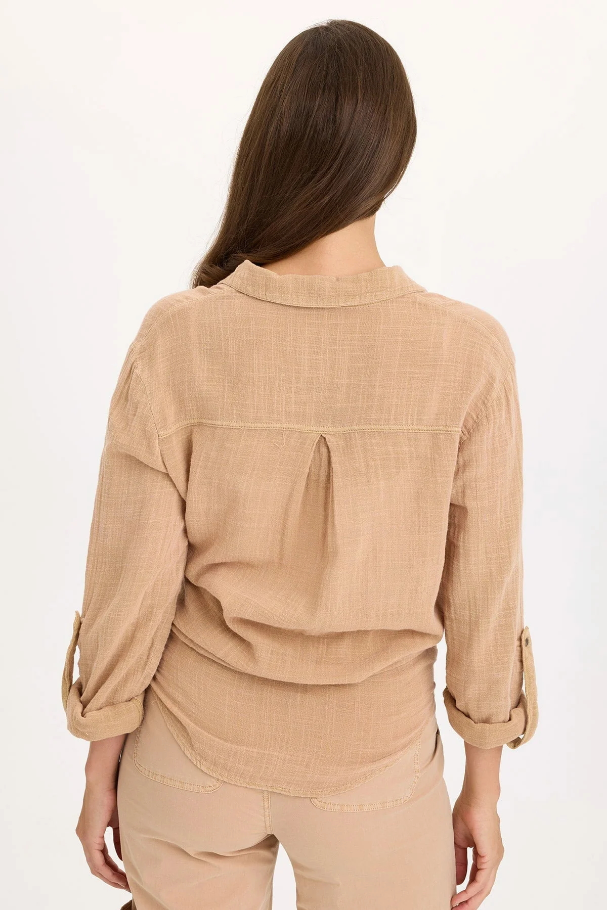 This gauze button-up blouse is great for layering. Features tabbed sleeve for easy rolling, curved hemline, and a box pleat on back.
