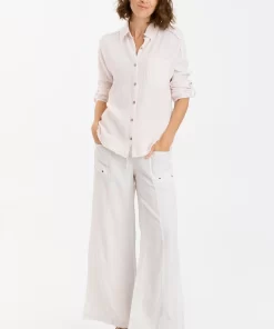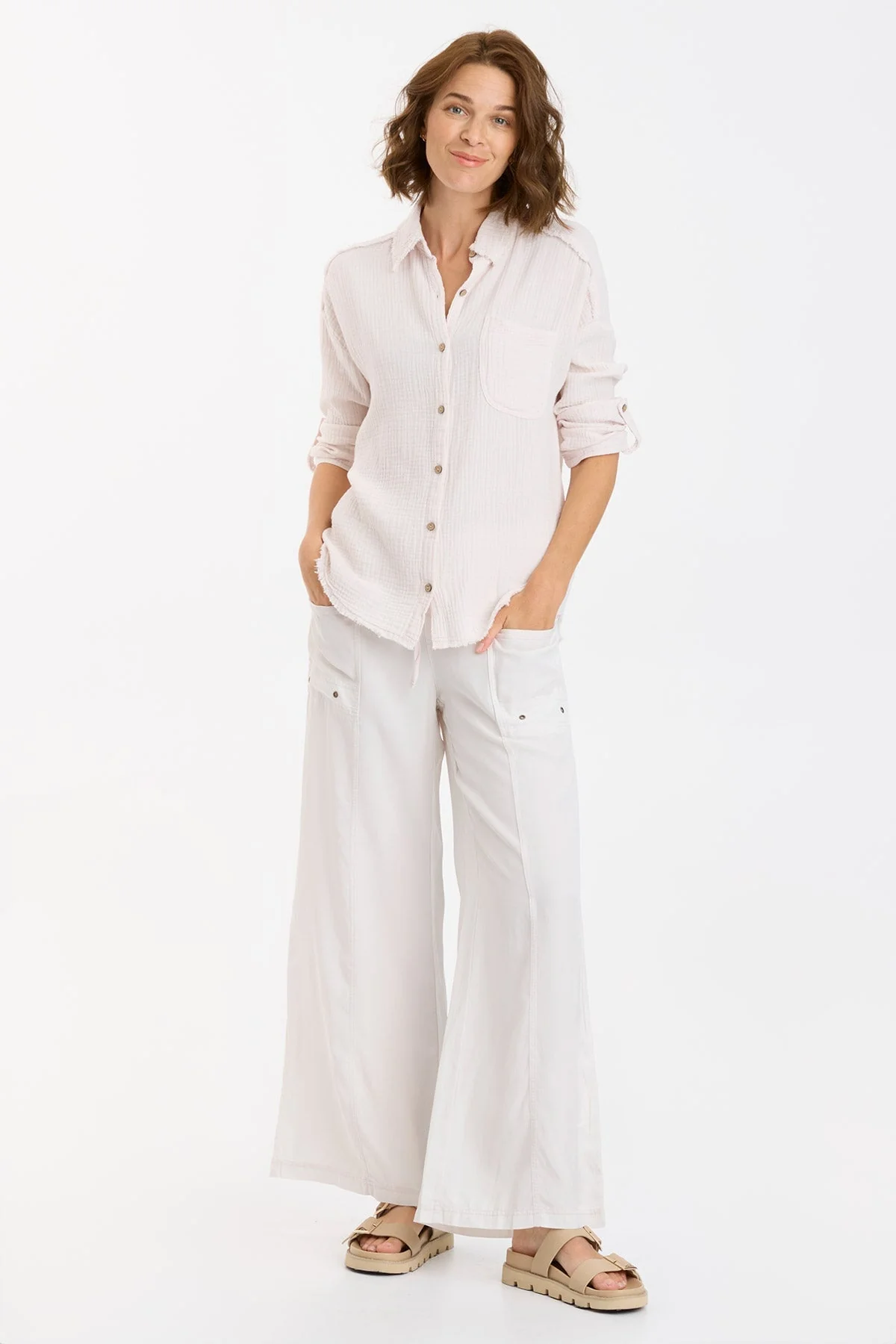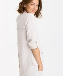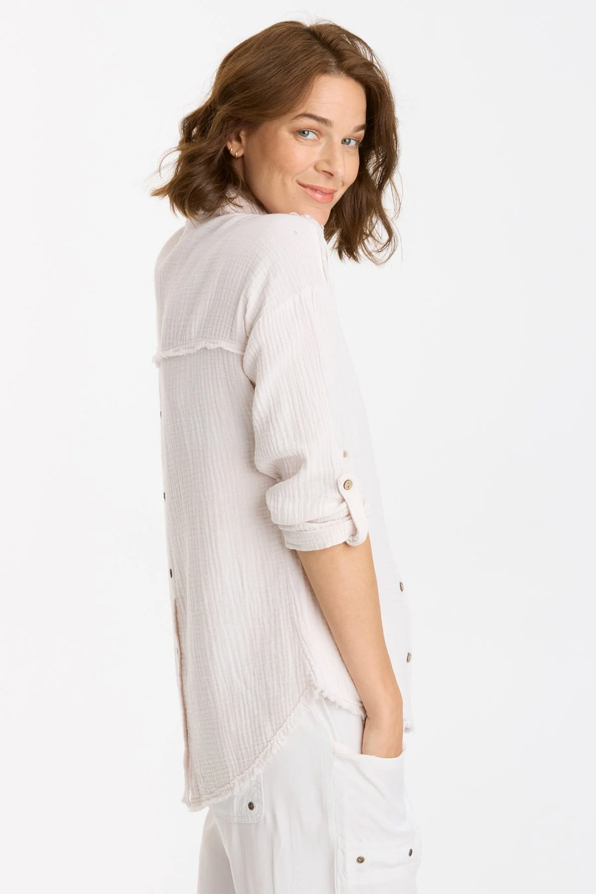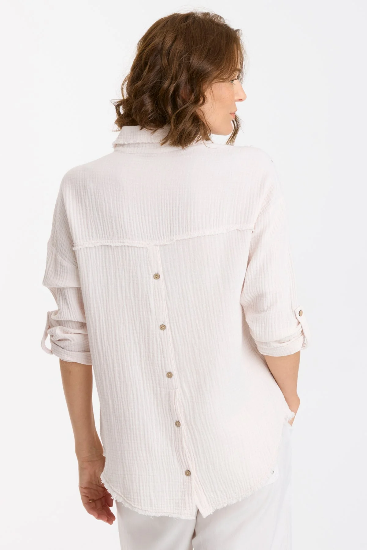 In Double Gauze, this blouse features coconut buttons, raw edges, dropped shoulder seams, along with a front and back yoke, a functional back placket, and tabbed three-quarter sleeves.