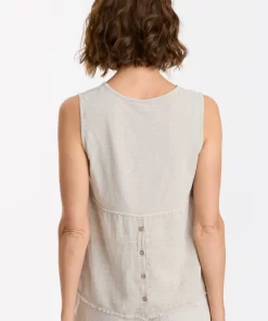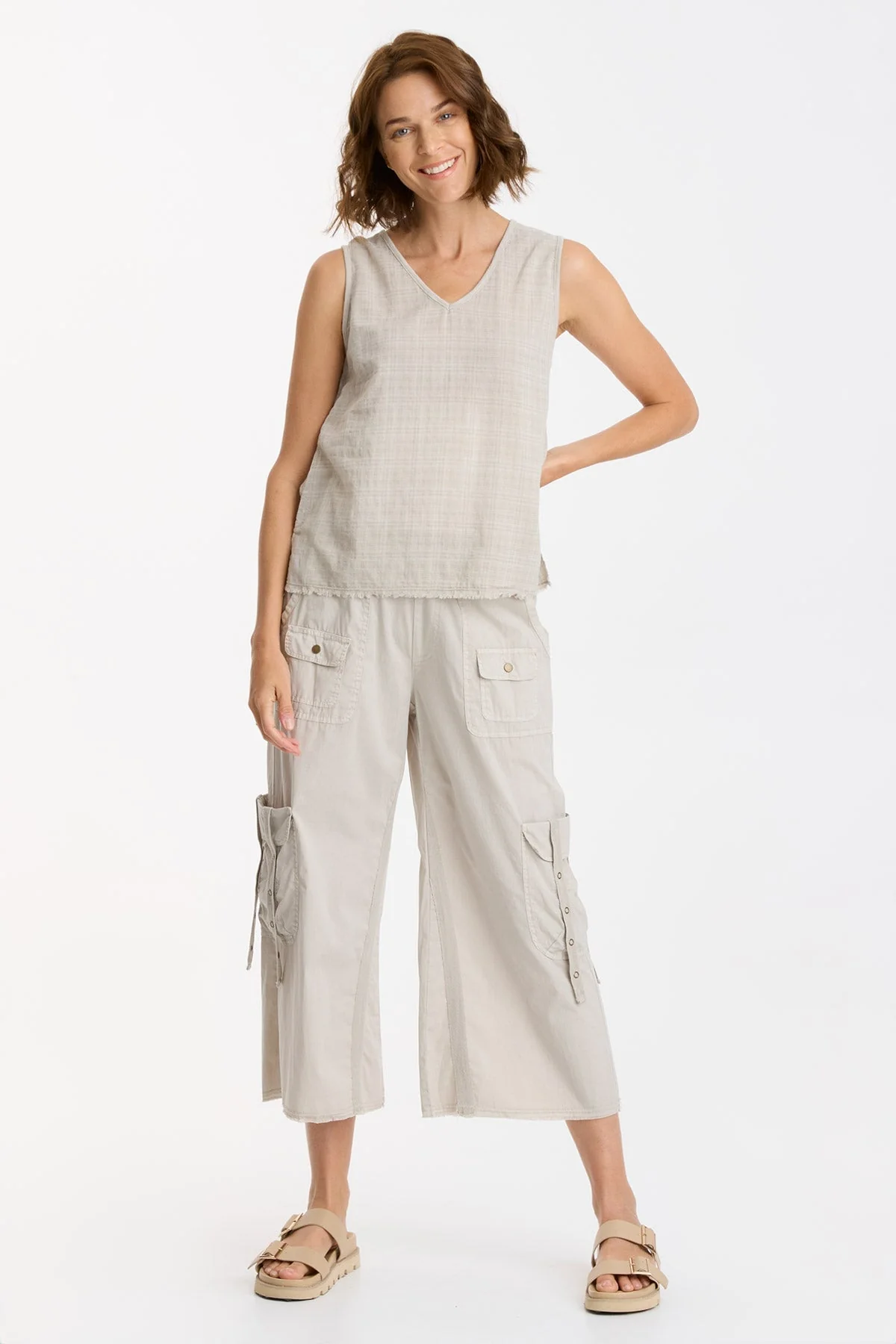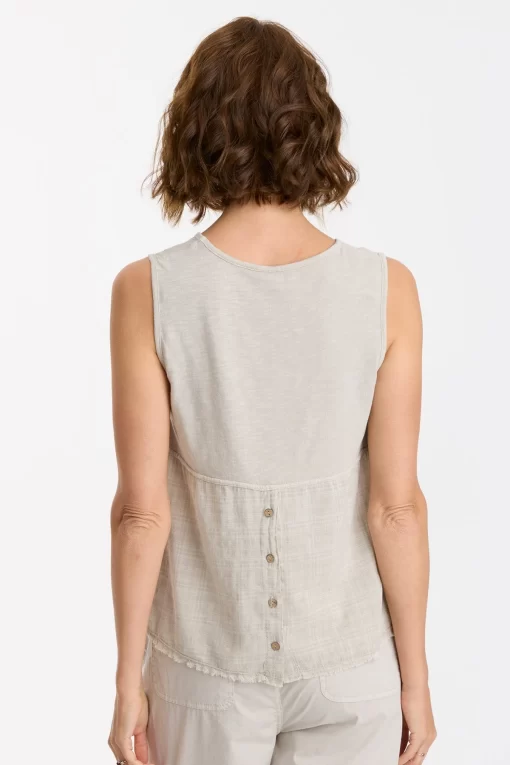 Our Tarley Plaid Voile brings the vintage inspo to this v-neck tank. A functional antique brass ring snap placket sits at the center back, while a contrasting slub jersey upper back panel keeps things breezy. Bra-friendly straps, a raw-edge hem, and cheeky side seam split top it all off.