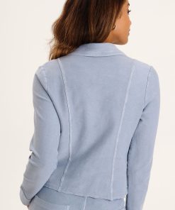 This slightly cropped blazer features raw edge details, three button closure, front pockets and a stretchy comfort knit.