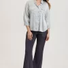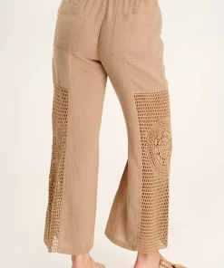 A linen pull-on waist, wide leg with a circular design, crochet leg panels, and front and back pockets make up the Tangent Pant.