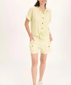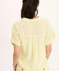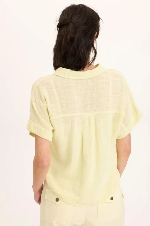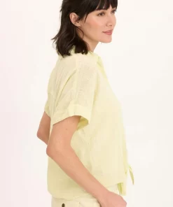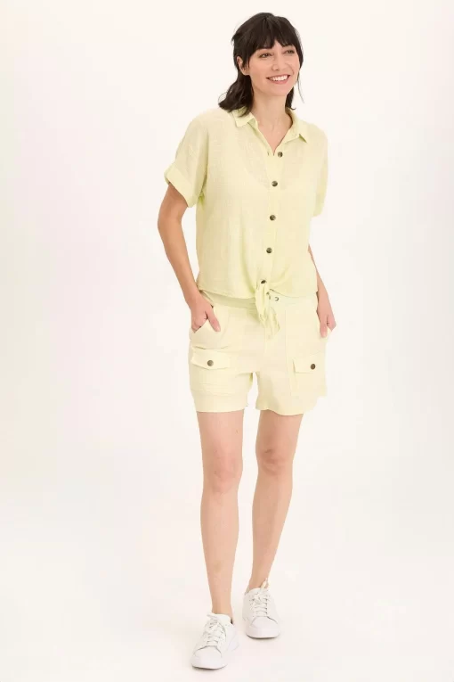We can’t get enough of tie front tops! Here is a classic tie front button-up. Cuffed short sleeves, tortoise buttons and a curved back hem with a box pleat make this style a must have!