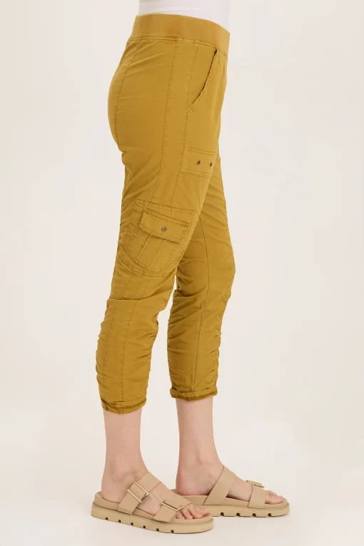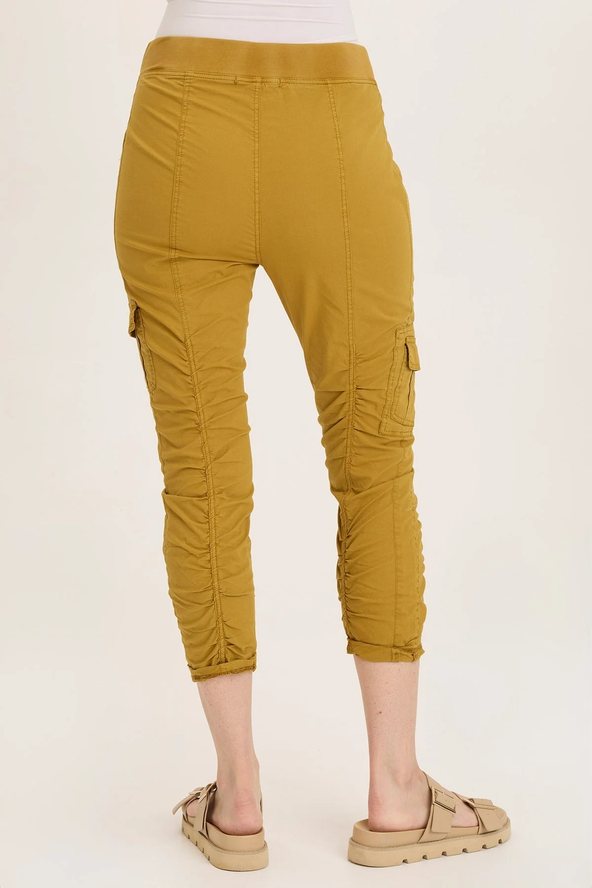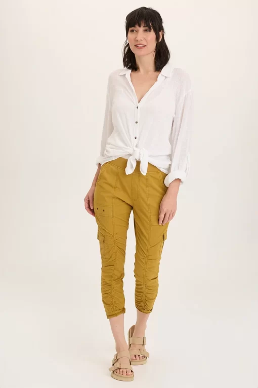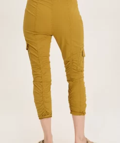 XCVI staples such as ruching grace the front leg of this grommet-detailed cargo crop. Complete with a pull-on waist and a skinny-cut leg.