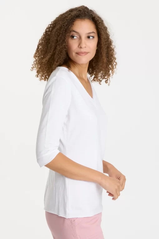 A three-quarter sleeve v-neck top made in soft jersey, Tina features raw edge details on the neck, sleeve opening, hemline, and center back seams.