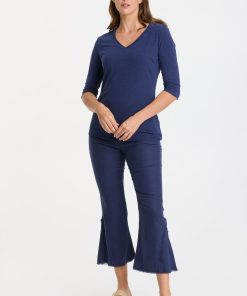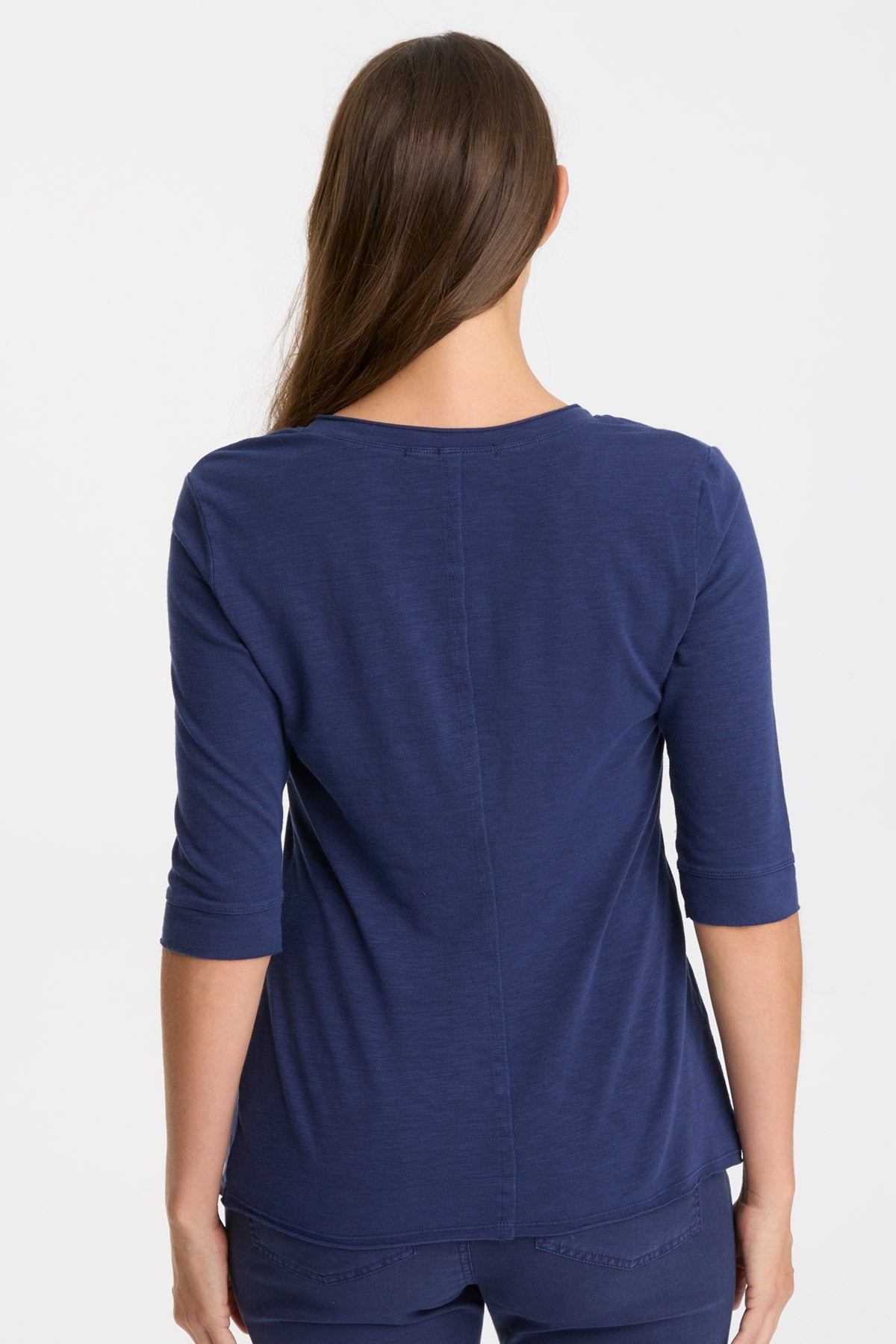 A three-quarter sleeve v-neck top made in soft jersey, Tina features raw edge details on the neck, sleeve opening, hemline, and center back seams.